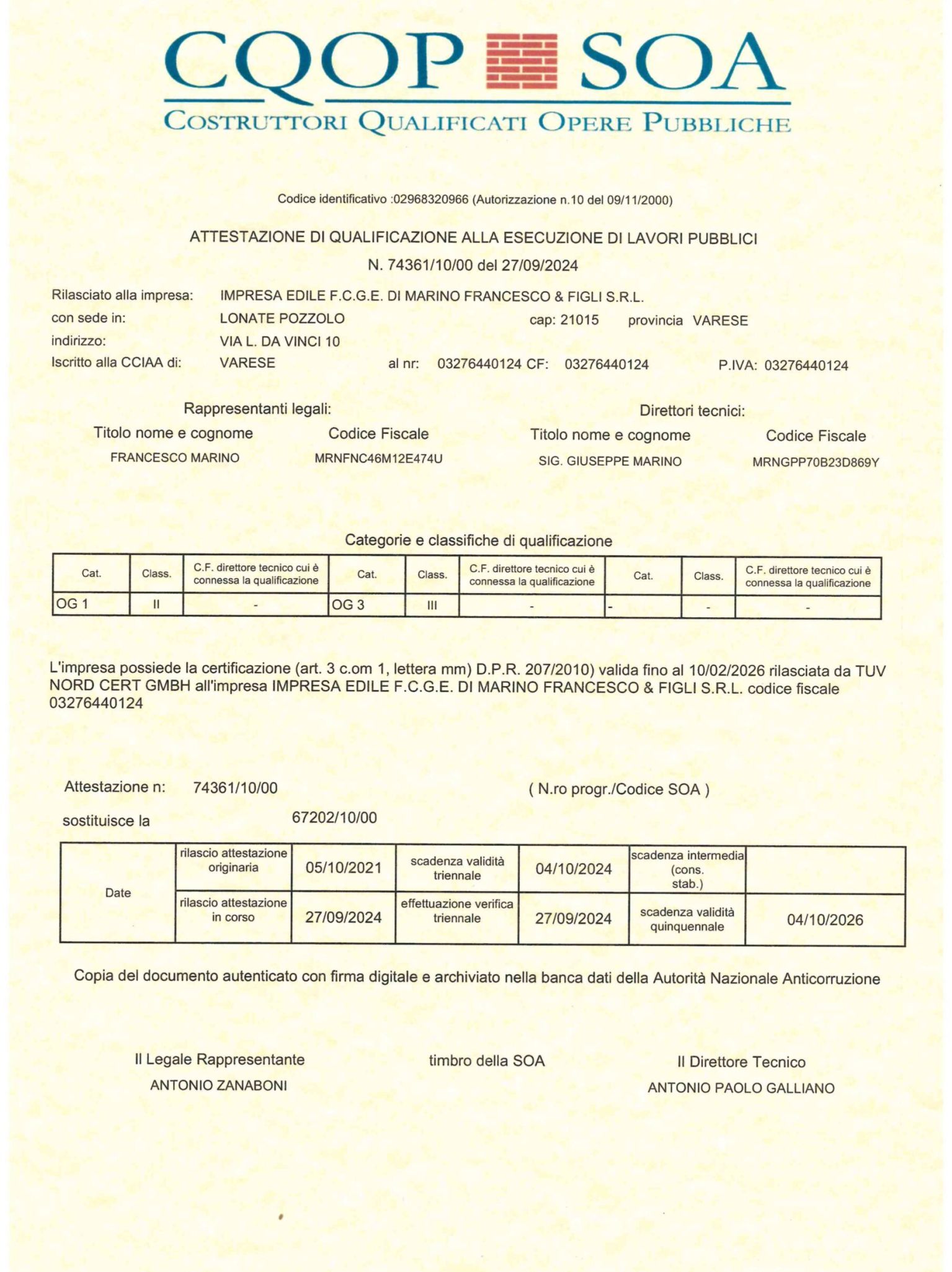 A partire dal 1° marzo 2012, l’impresa MARINO FRANCESCO (ditta individuale) è stata conferita nell’IMPRESA EDILE F.C.G.E. di MARINO FRANCESCO & FIGLI SRL, con sede a Lonate Pozzolo (VA) in Via L. Da Vinci n. 10 – C.F./P. IVA 03276440124 – Capitale Sociale di € 100.000,00.